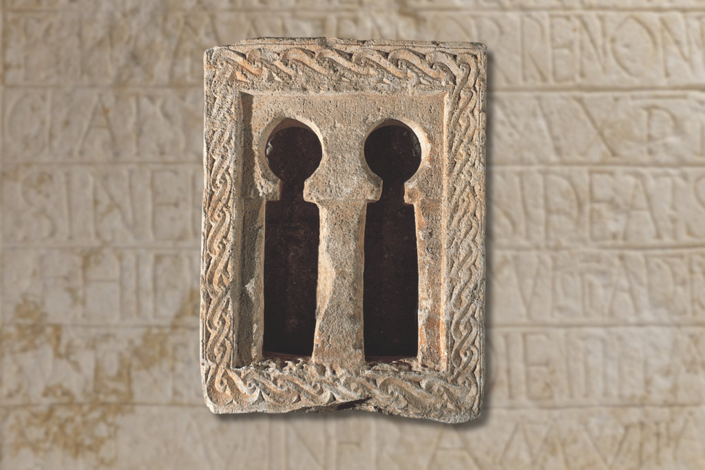 La quinta de las ventanas es bífora (con dos vanos). Posee dos arcos ligeramente en herradura y su orla perimetral se decora con los clásicos motivos de trenzas de dos lazos.